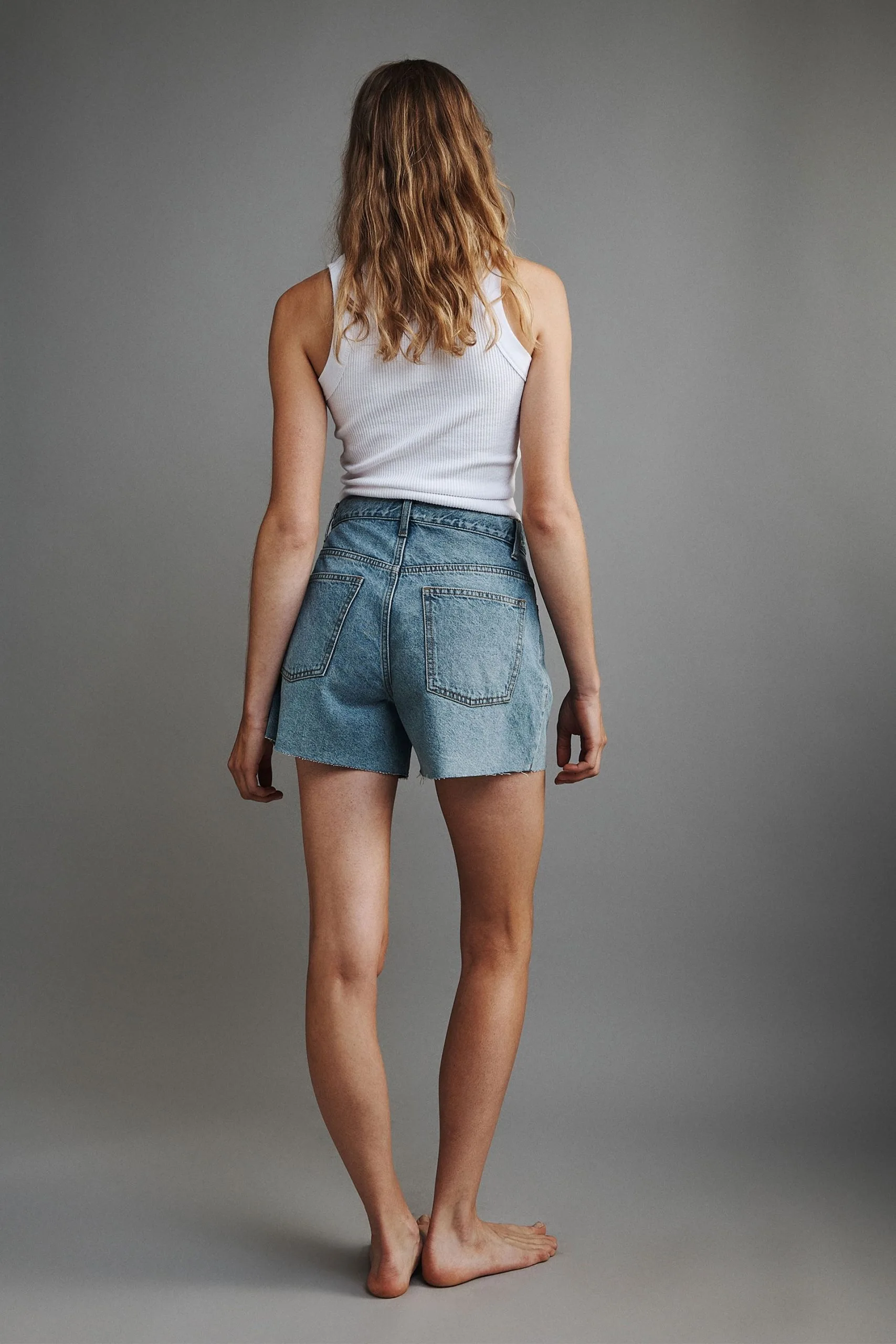 Perfect for those warmer days, this garment is your classic denim short with high waistline, A line fit and five pockets addition to keep your belongings in place. Perfect to pair with a tank, tee or your fave bralette for that effortless summer look.