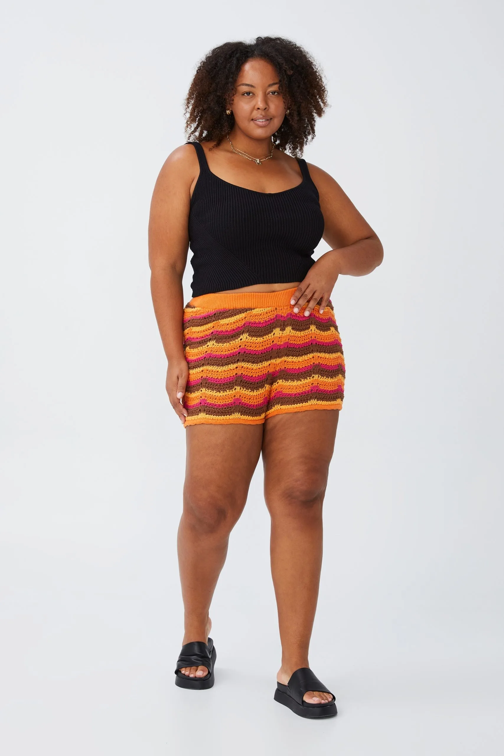 Open crochet style fabric, Elastic at waist, Scalloped hem, Fitted – Designed to relax with wear