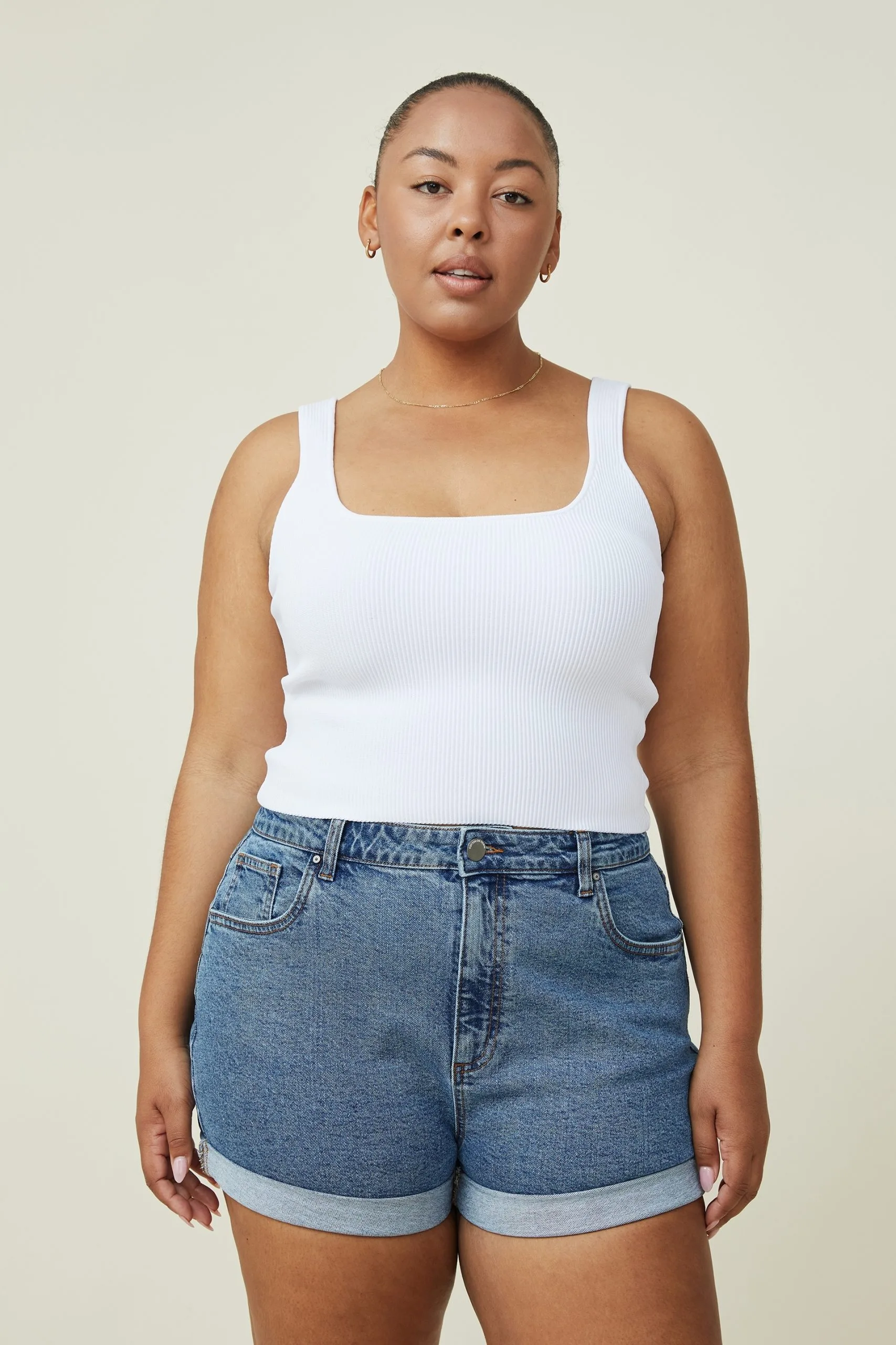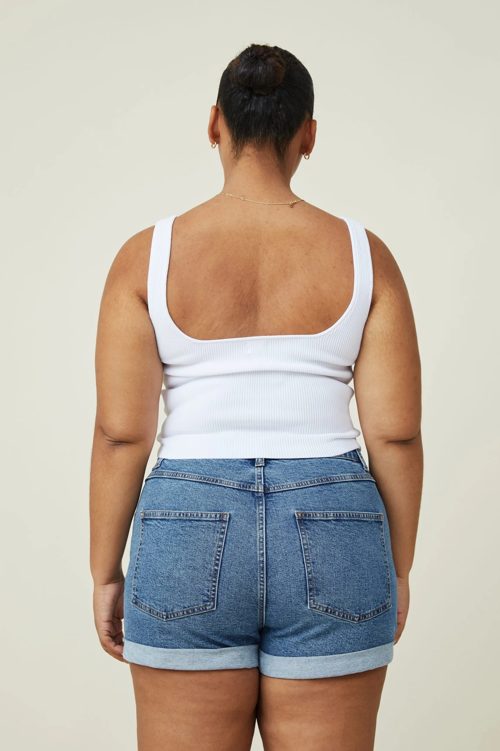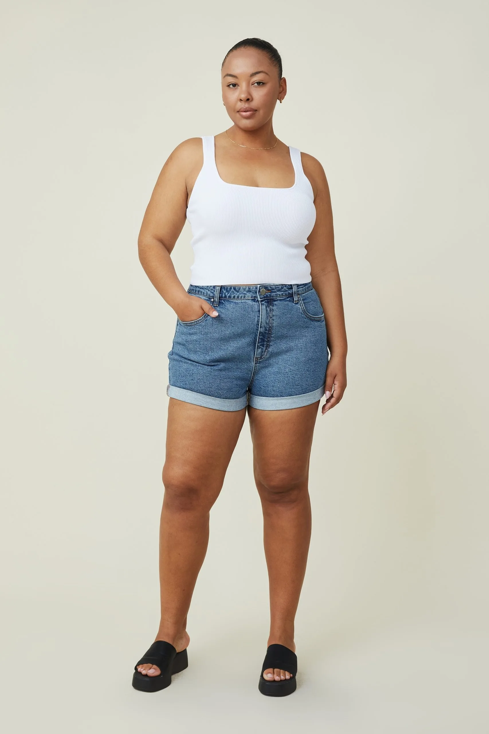 High waist, mini length. There’s a lot to love about high rise classic stretch denim short. Made from comfortable stretch denim fabric for a little extra give, this denim short is a wardrobe staple year round.