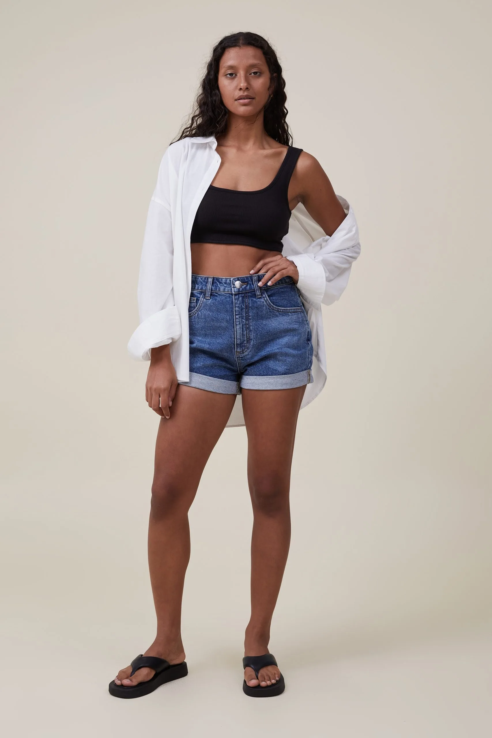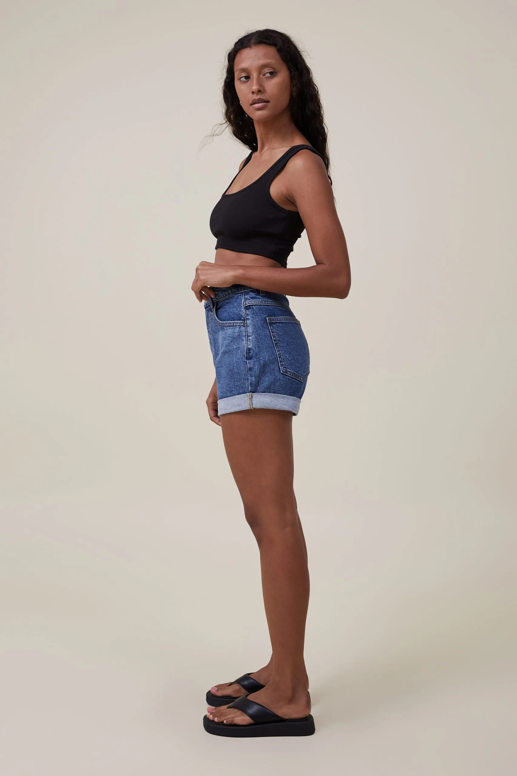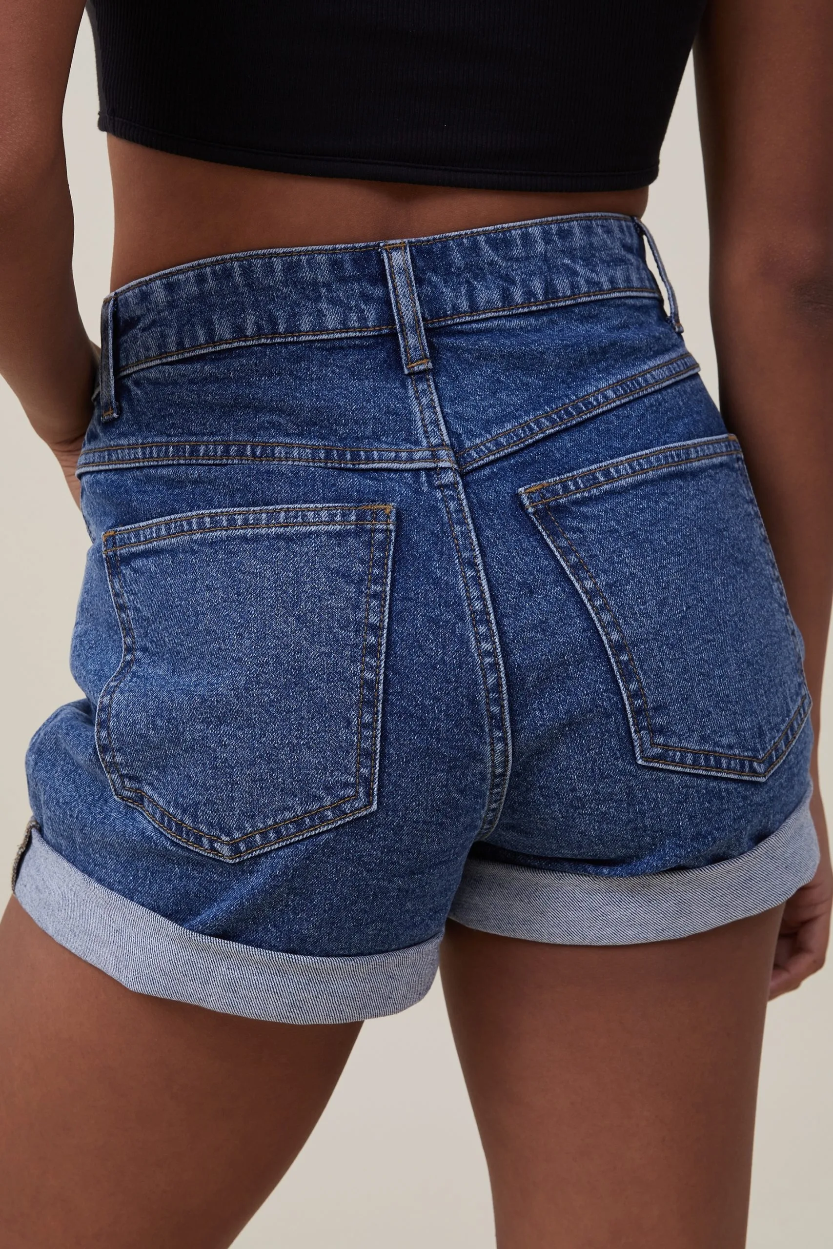 High waist, mini length. There’s a lot to love about high rise classic stretch denim short. Made from comfortable stretch denim fabric for a little extra give, this denim short is a wardrobe staple year round.