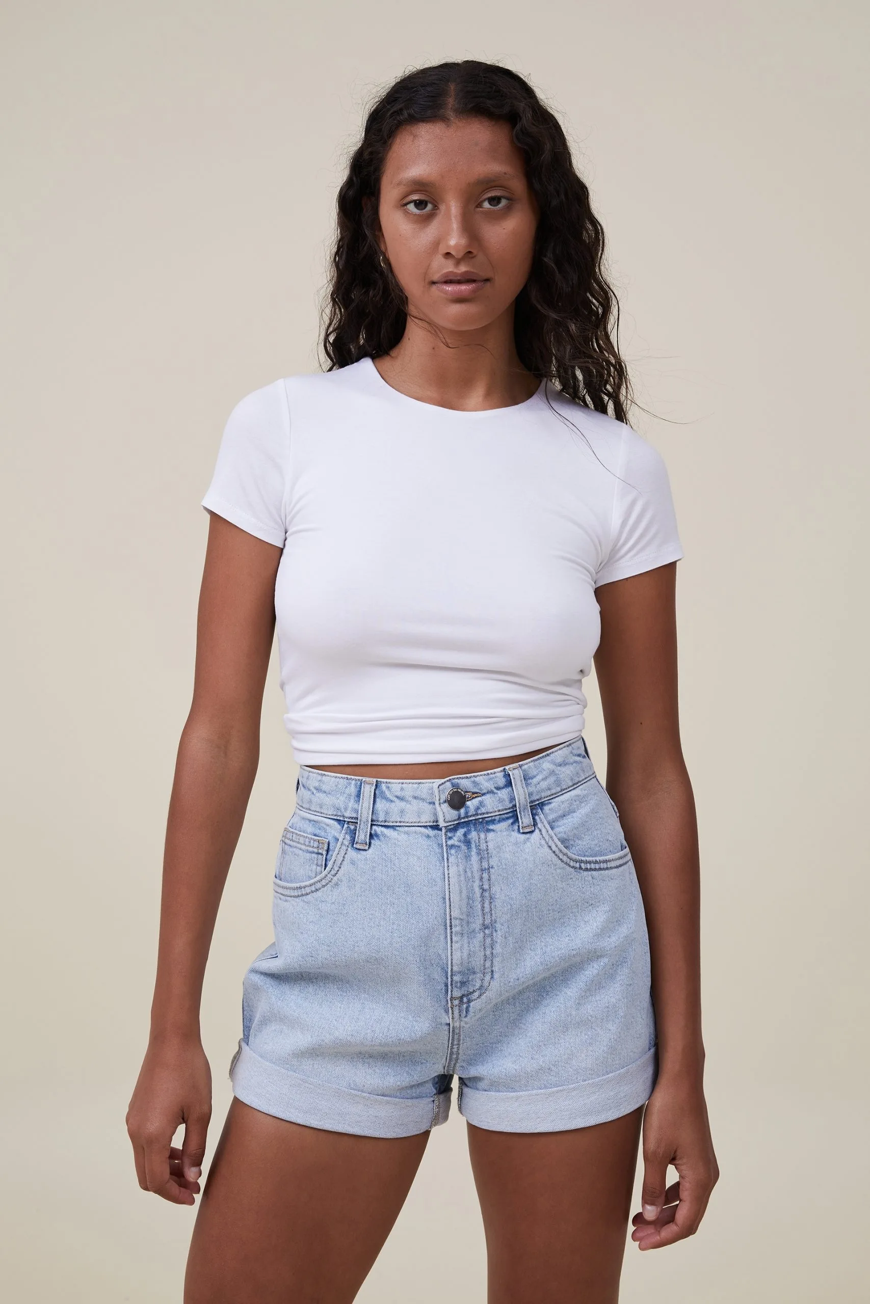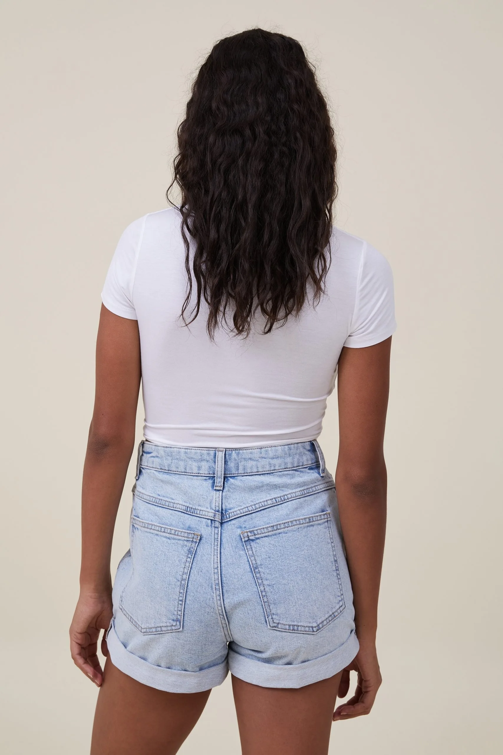 High waist, mini length. There’s a lot to love about high rise classic stretch denim short. Made from comfortable stretch denim fabric for a little extra give, this denim short is a wardrobe staple year round.